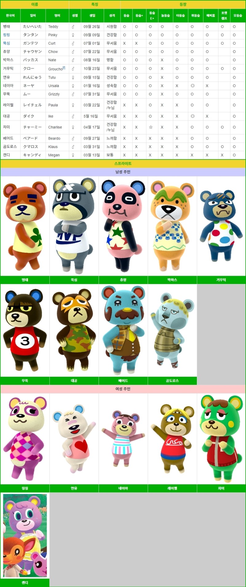 곰 : 병태, 링링, 뚝심, 츄양, 박하스, 거무틱, 연유, 네이아, 무뚝, 레이첼, 대공, 챠미, 베어드, 곰도로스, 캔디가 있습니다.
