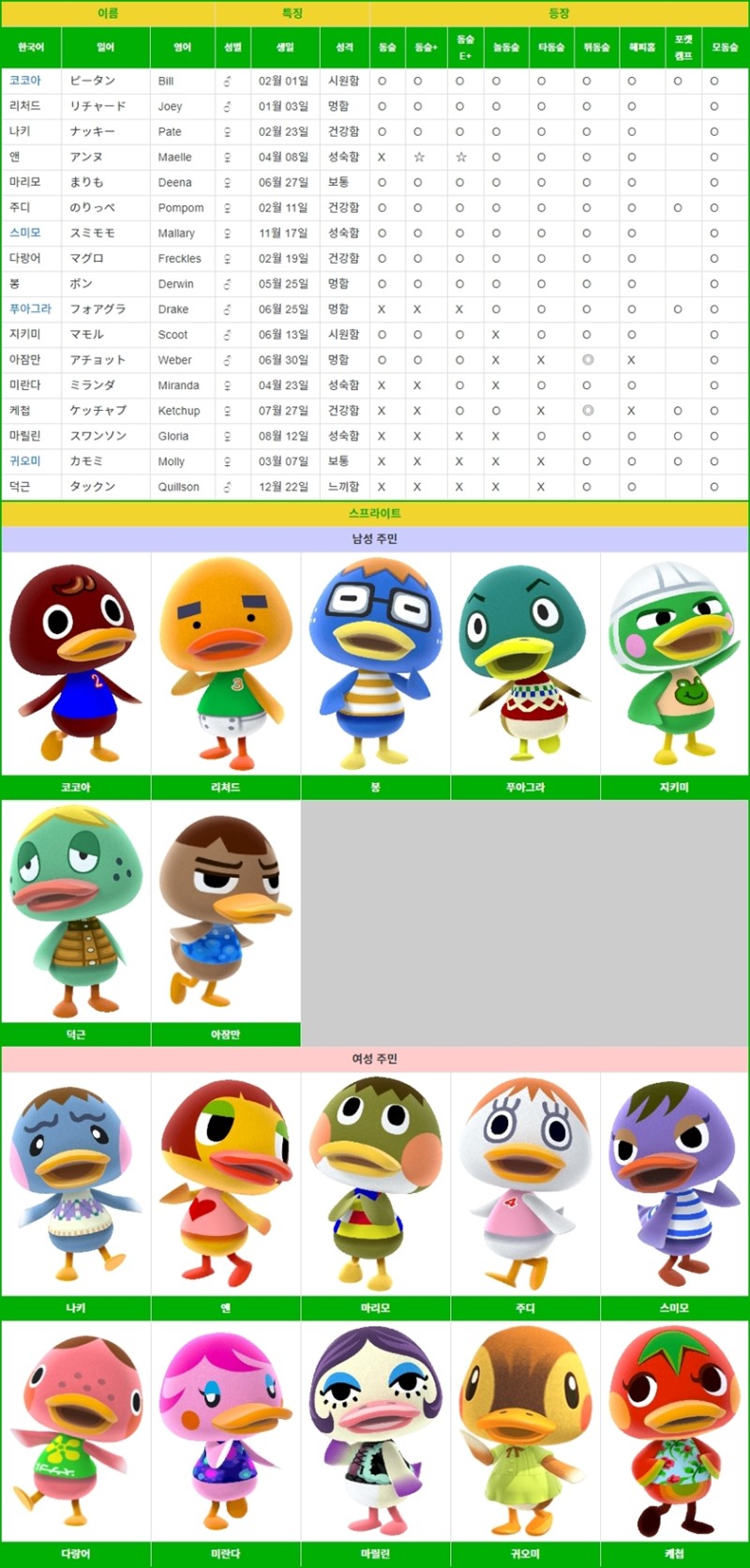 오리 : 코코아, 리처드, 나키, 앤, 마리모, 주디, 스미모, 다랑어, 봉, 푸아그라, 지키미, 아잠만, 미란다, 케첩, 마릴린, 귀오미, 덕근