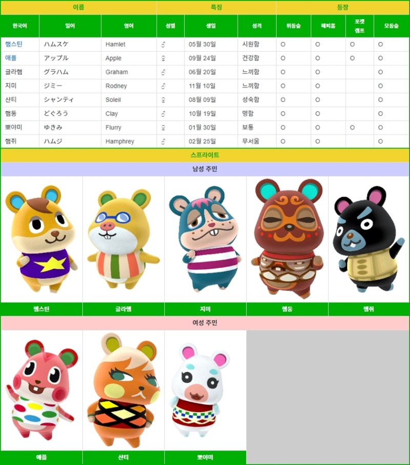 햄스터 : 햄스틴, 애플, 글라햄, 지미, 샨티, 햄둥, 뽀야미, 햄쥐