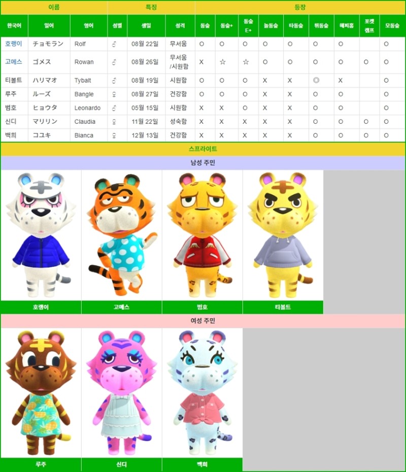 호랑이 : 호랭이, 고메스, 티볼트, 루주, 범호, 신디, 백희