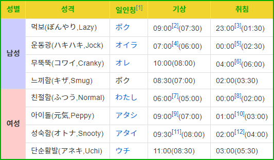 동물의 숲 주민들은 8개의 성격으로 나뉩니다. 그리고 성격마다 성별도 다릅니다. 성격에 따라 목소리, 기상, 취침 시간과 대사도 달라집니다.