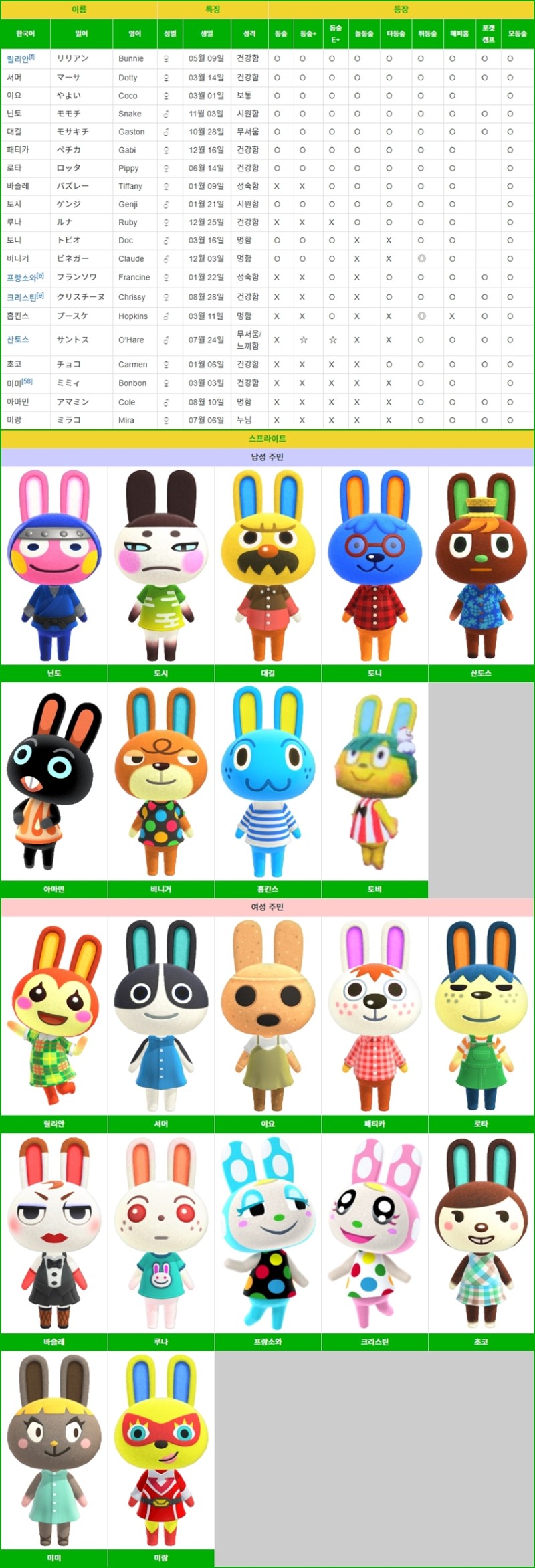 토끼 : 릴리안, 서머, 이요, 닌토, 대길, 패티카, 로타, 바슬레, 토시, 루나, 토니, 비니거, 프랑소와, 크리스틴, 홉킨스, 산토스, 초코, 미미, 아마민, 미랑