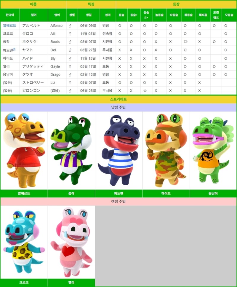 악어: 알베르트, 크로크, 풍작, 파도맨, 하이드, 앨리, 용남이