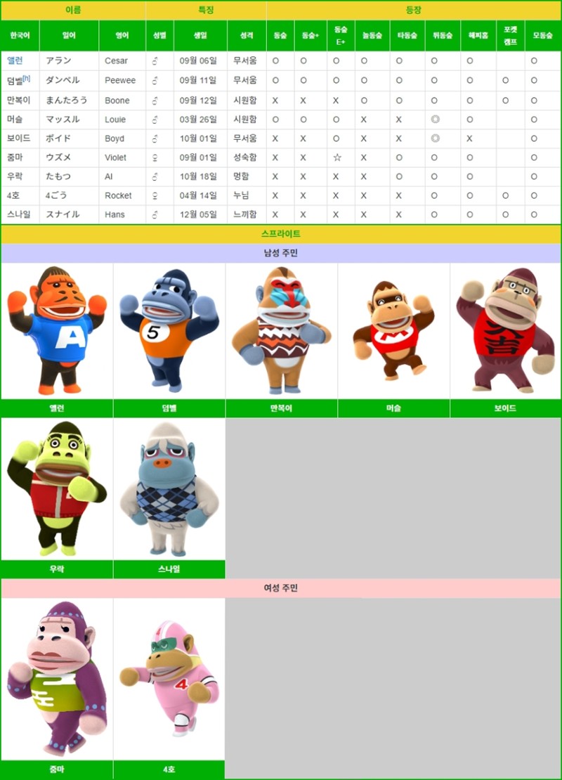 모여봐요 동물의 숲 주민 리스트 성격별 (먹보/운동광/무뚝뚝/친절함/아이돌/성숙함/단순활발) ��