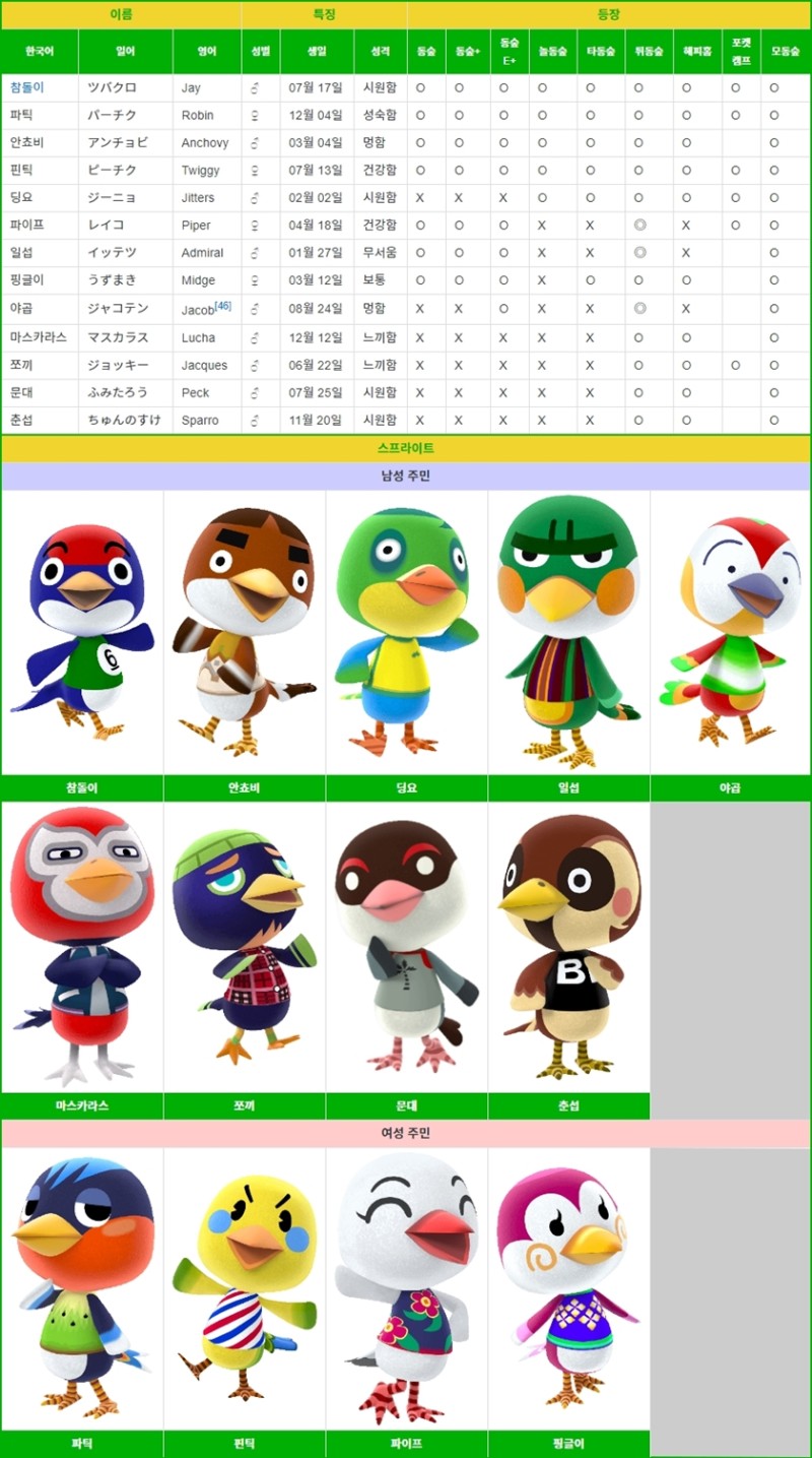 모여봐요 동물의 숲 주민 리스트 성격별 (먹보/운동광/무뚝뚝/친절함/아이돌/성숙함/단순활발) ��