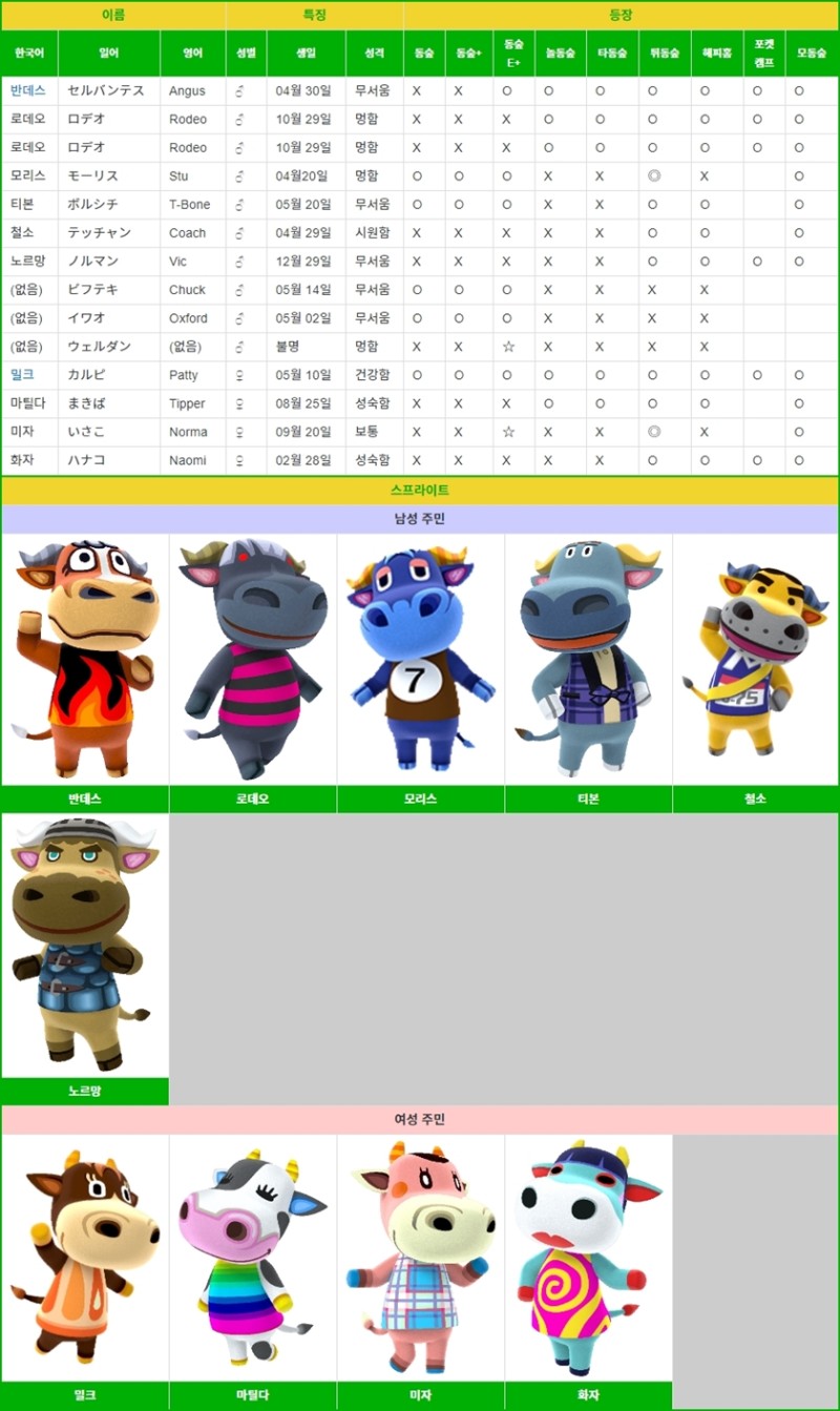모여봐요 동물의 숲 주민 리스트 성격별 (먹보/운동광/무뚝뚝/친절함/아이돌/성숙함/단순활발) ��