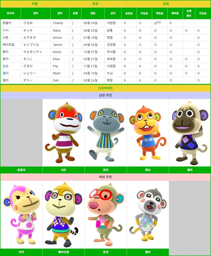 원숭이 : 키키, 시몬, 에이프릴, 몽티, 몽자, 원승, 젤리, 델리