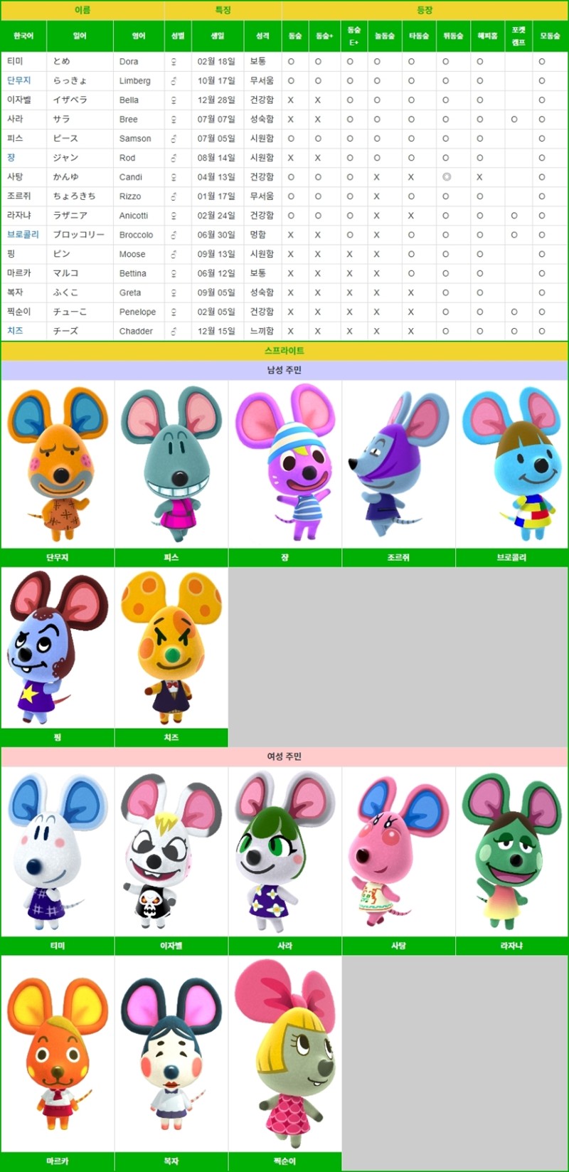 모여봐요 동물의 숲 주민 리스트 성격별 (먹보/운동광/무뚝뚝/친절함/아이돌/성숙함/단순활발) ��