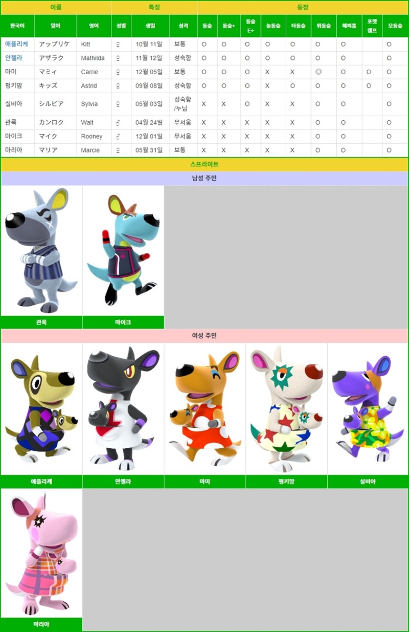 캥거루 : 애플리케, 안젤라, 마미, 펑키맘, 실비아, 관록, 마이크, 마리아