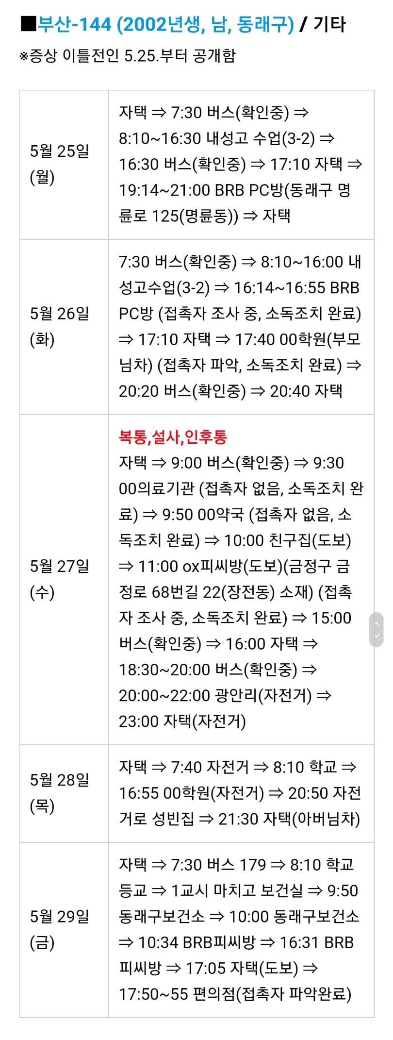 내성고는 수업을 원격수업으로 전환하였고 6월 12일 예정되었던 중간고사도 연기하는 등 일정을 변경하였습니다. 해당 확진자 학생은 감기 증상을 느끼고 동래구의 의원을 찾았는데 처음엔 인후염 진단을 받았다고 합니다. 이후 상태가 호전되어 등교했다가 학교에 있는 중 다시 증상이 나타나 조퇴하고 동래구 보건소에서 코로나19 검사를 받았고, 그 결과 양성으로 확인되었습니다. 검사 직후 해당 학생은 BRB PC방(동래구 명륜동)에 머물렀습니다.