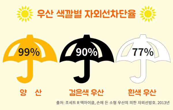 만약 우산으로 양산을 대신한다면 흰색보단 검은색 우산을 쓰는 것이 좋습니다. 피부과 전문의 맥마이클 박사의 연구 결과에 의하면, 흰색 우산(77%)보다 검은색 우산(90% 이상)이 상대적으로 더 높은 자외선 차단율을 보였기 때문이죠. 양산이 없다면 검은색 우산을 들고 외출해도 좋습니다.