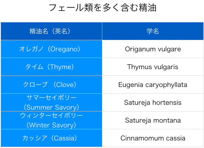 페퍼민트, 타임, 시나몬, 유칼립투스 ,티트리, 오레가노 ,크롭, 바질, 스토르넬라, 파슬리, 일랑일랑, 마조람, 넛맥 등