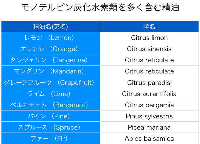 감귤류, 소나무오일, 라벤더, 시트로넬라, 카모마일, 로즈마리, 레몬, 오렌지 등