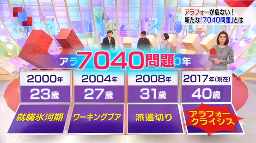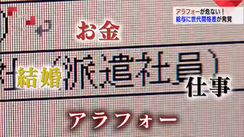 아라포 세대는, 졸업했을때 희망했던 회사와 업종에 취직하지 못했고, 이직을 한 사람이 다른 세대보다 더 많다. 이에 대해서, 도쿄 대학의 겐다 유우지 교수는 "전직한 경우 중소 기업에 들어가는 것이 많아지고 있었습니다. 근속 연수는 평가되서, 옮기고 근속 연수가 짧아지면 임금이 꽤나..." 중소 기업이 되기 쉬운 일이나 근속 년수가 급여액에 영향을 끼치는 것 등이 원인으로 급여가 낮아지고 있다고 한다.