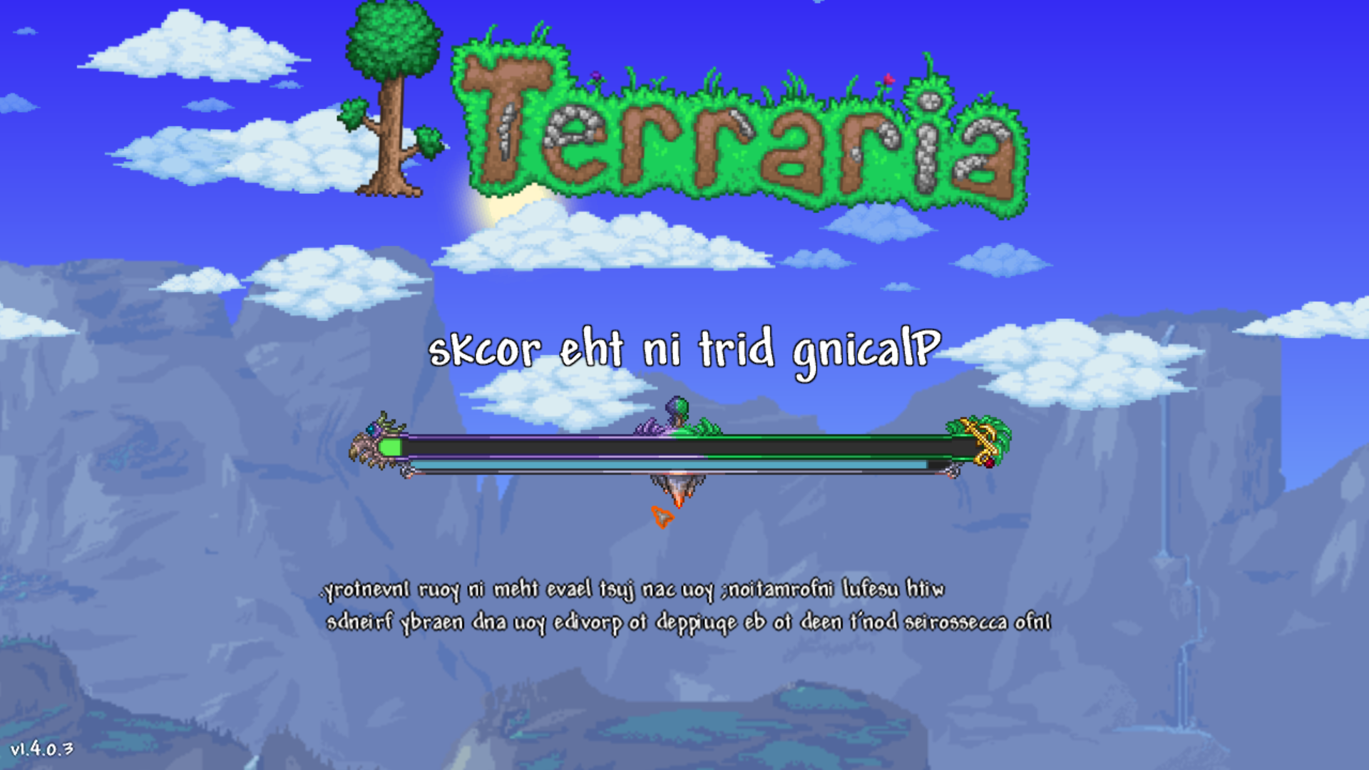 이 특별한 세계는 게임의 난이도를 크게 높히는 걸 목표로 합니다. 맵 생성 시 문구가 전부 앞뒤로 뒤집힌다. 제작자 공인 마스터 모드보다도 더 어려운 맵이 생성되는 시드이며, 온갖 부조리함이 넘치는 맵과 고유한 시스템으로 무장되어 있습니다.