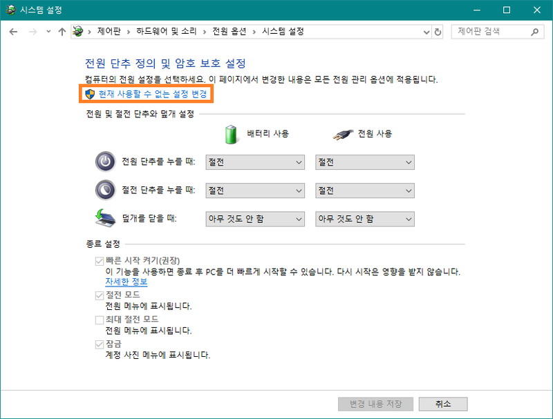 '현재 사용할 수 없는 설정 변경' 클릭 후, '빠른 시작 켜기(권장)' 체크를 해제