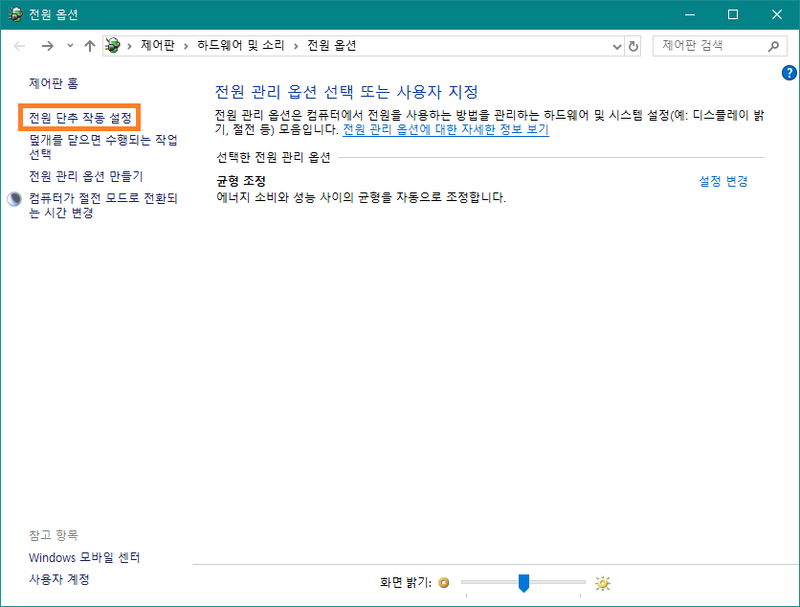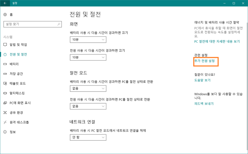 시스템 - 전원 및 절전 - 추가 전원 설정