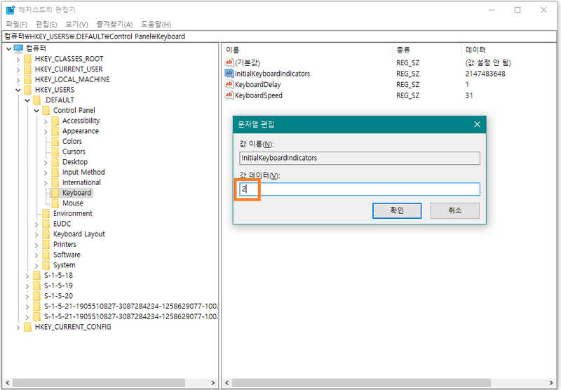'HKEY_USER' -> '.DEFAULT' -> 'Control Panel' -> 'Keyboard' -> 'InitialKeyboardIndicators' 더블 클릭