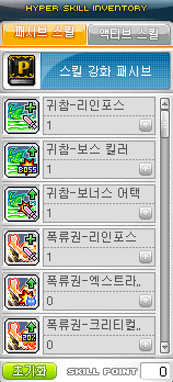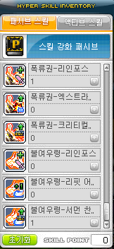 폭류권1과 귀참1을 배운후 패시브를 마스터합니다.(고급너클숙련,약점간파,정령결속4식 3개다 뛰어난 패시브기때문에 필요에 따라 변경 하셔도됩니다) 이후 사냥기와 보스기 마스터후 분혼격참(보스필수)과 무적기, 패시브, 용사의의지를 마스터 해주시면 됩니다.