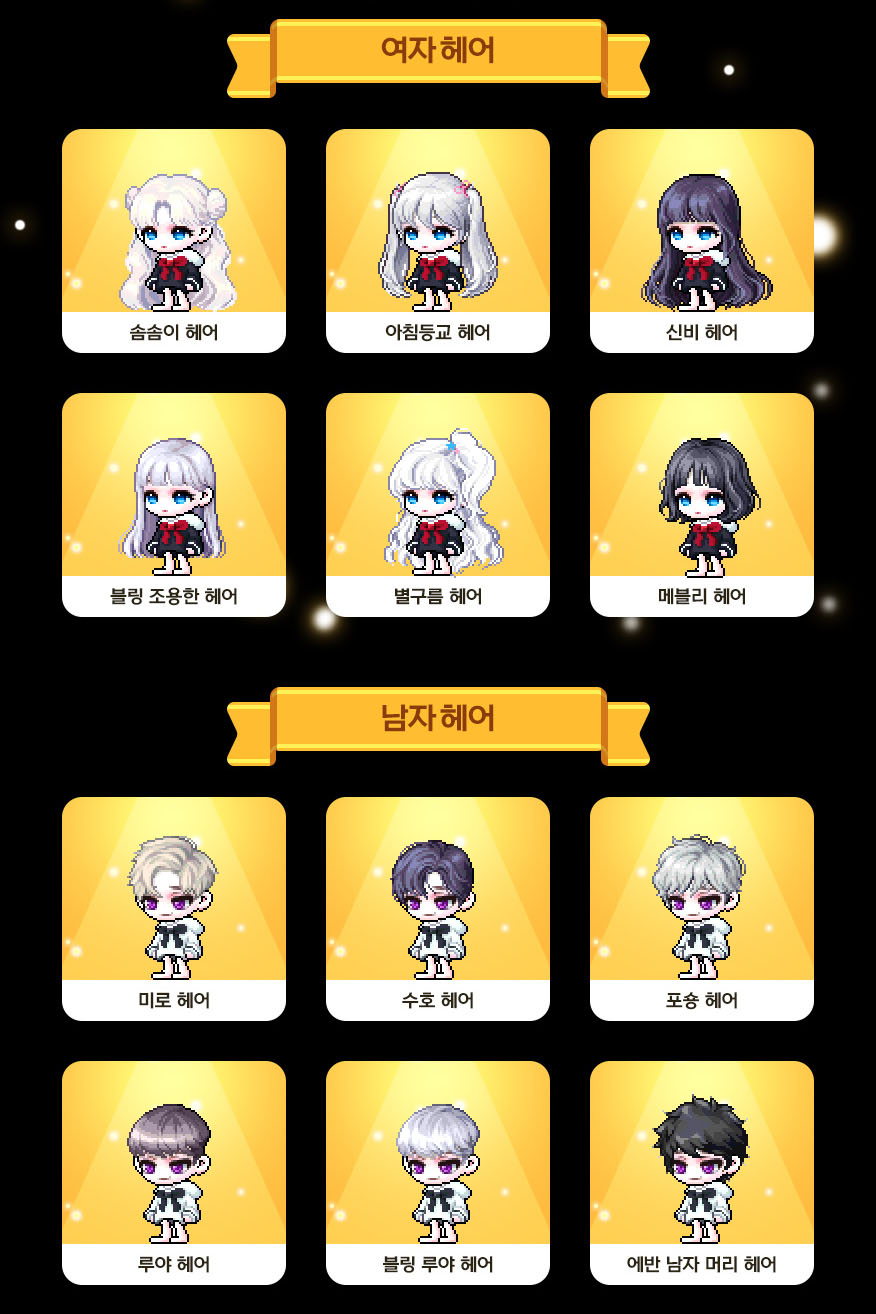 여자 헤어 : 솜솜이 헤어, 아침등교 헤어, 신비 헤어, 블링 조용한 헤어, 별구름 헤어, 메블리 헤어