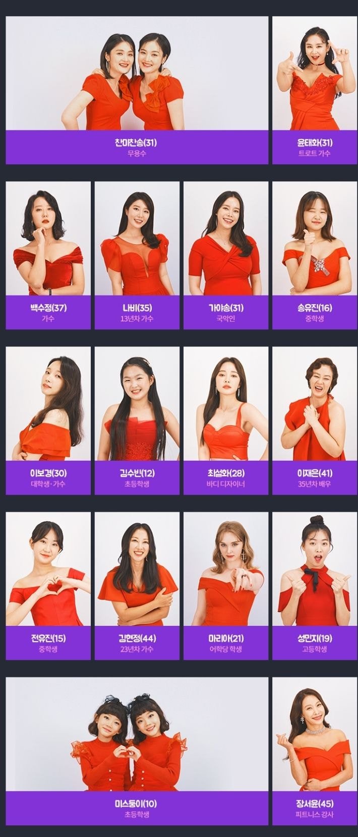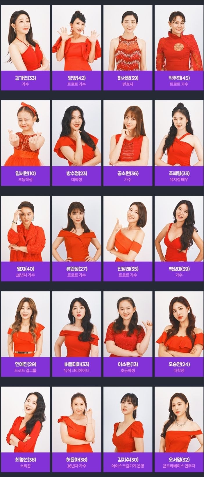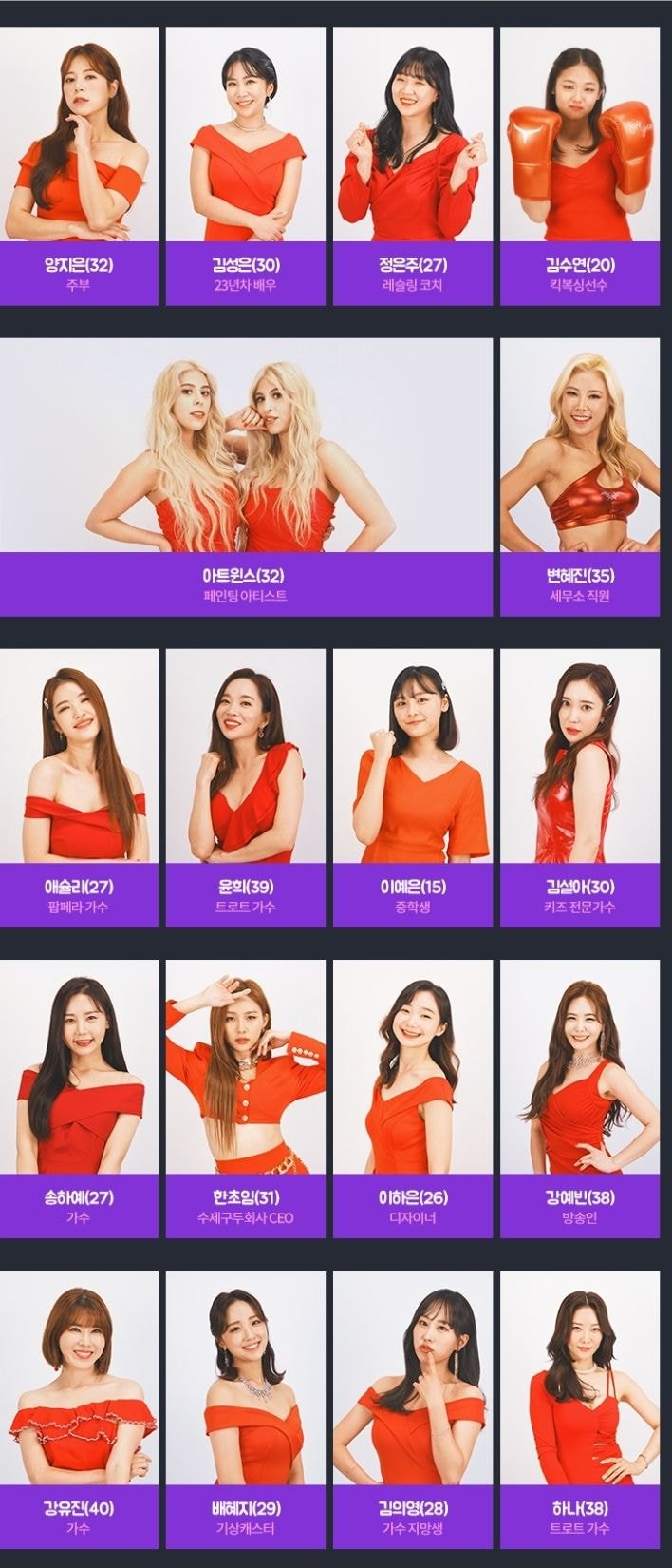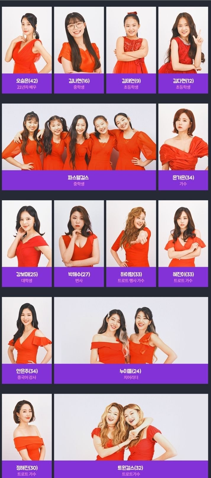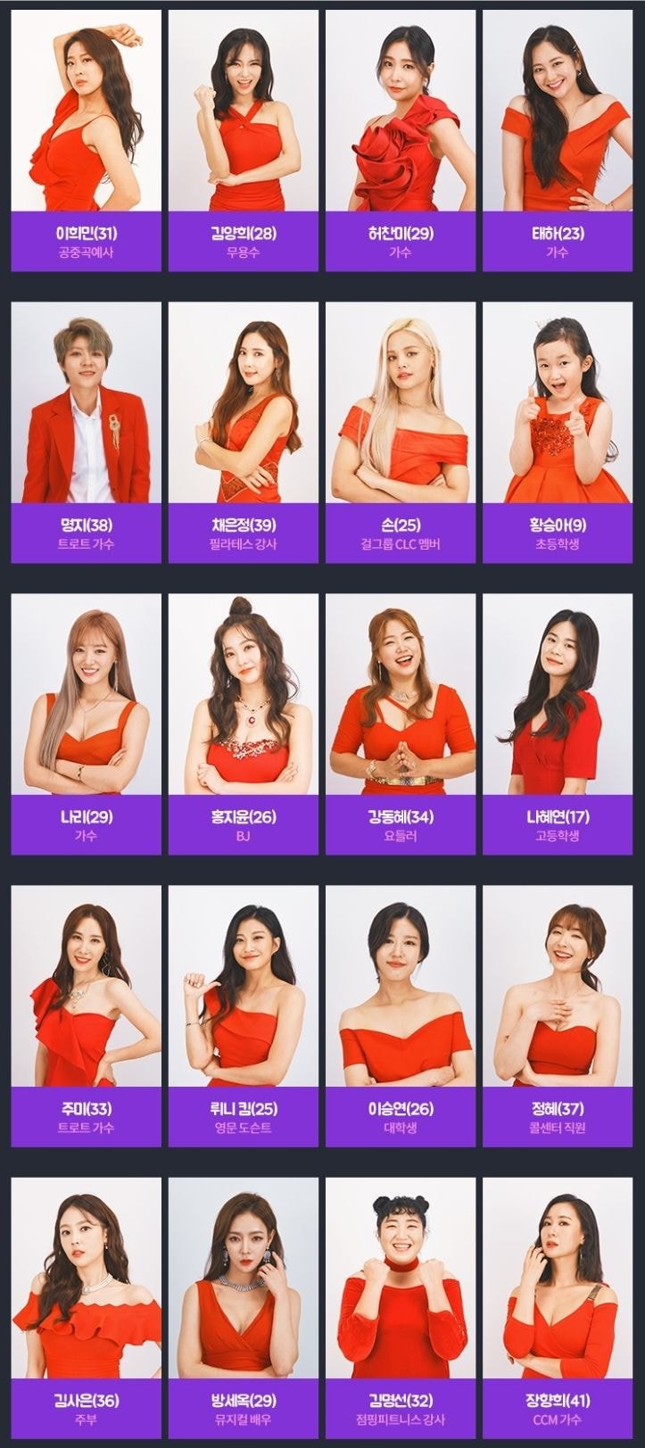 박슬기씨나 채은정씨, 오승은씨 등 근황이 궁금했던 연예인 분들이나, 각종 서바이벌 프로에서 봤던 걸그룹 멤버 또는 오디션 참가자들도 많이 보이네요. 특히 모모랜드 멤버였던 태하나, 모두가 잘아는 허찬미양도 나온다는 건 놀랍습니다. 소사이어티 게임에서 봤던 최설화씨나 유튜버 버블디아씨도 의외의 참가자입니다.