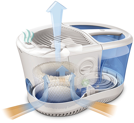 가습기 안에 필터가 있고 그 필터에 바람을 이용해 증발이 일어나게 합니다.