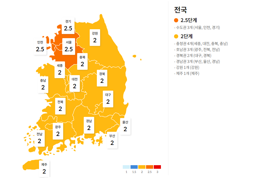현재 지역별 거리두기 단계는 다음과 같습니다.