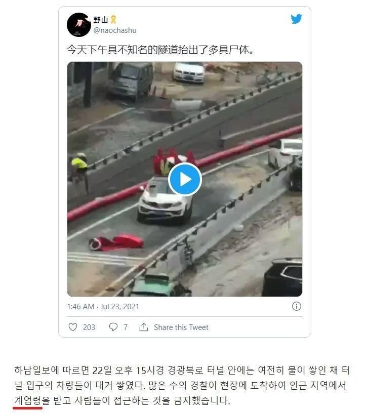 침수 터널 인근 도시 계엄령이 발동되었으며