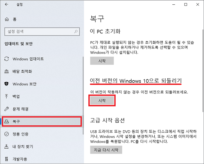 만약 19H2에서 20으로 업데이트 했을 경우 10일 이내 빌드 이전버전으로 아예 돌아갈 것.