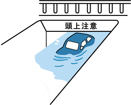 그럼에도 불구하고 운전 중에 폭우가 내릴 수 있습니다. 그 때는 물이 차기 쉬운 고가 다리 교차지점의 아랫길, 지하차로, 다리나 강, 해안 주변길, 급경사지에는 접근하지 않는 것이 중요합니다.
