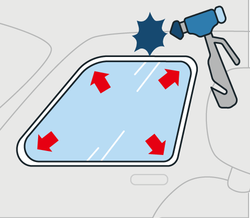 긴급 탈출용 공구를 가지고 있는 경우는 사이드 유리의 네 모퉁이를 나누어 피난한다(프런트 유리는 공구에서도 깨지지 않는다)