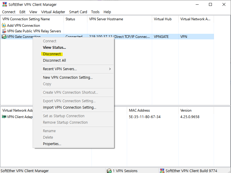 ▲VPN Gate Connection 우클릭 후 Disconnect 클릭