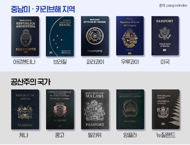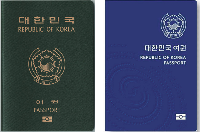 우리나라 여권은 녹색에서 남색으로, 푸른 계통으로 변화중이라는 차이가 있다.