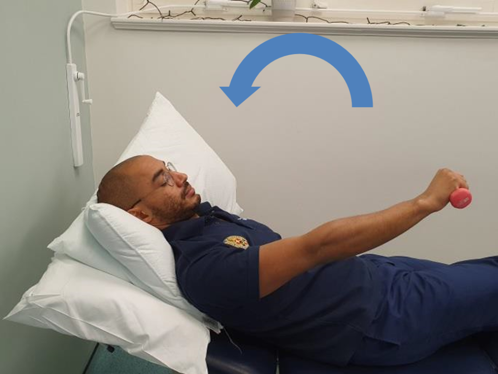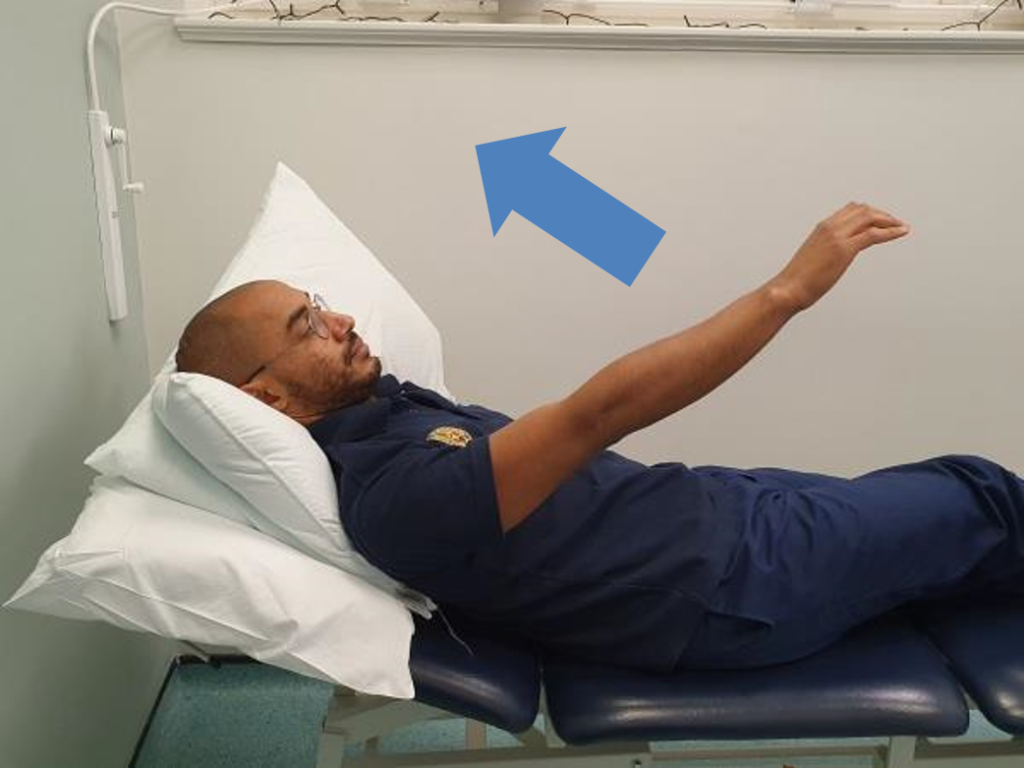 - 운동을 더 쉽게 하기 위해, 중력에 대항하여 운동할 필요가 없도록 등을 대고 누워 운동을 시작합니다(운동 2). 이는 팔을 들어 올리려고 할 때 어깨를 으쓱하거나 '히칭'하는 것을 방지하는 데 도움이 됩니다. 가능한 한 '히칭'을 피하려고 노력하십시오.
