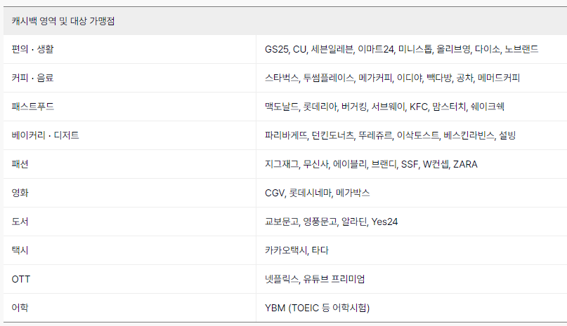8개 영역에서 각 1일 1회 캐시백 받을 수 있으며, 대상 브랜드는 아래와 같아요.