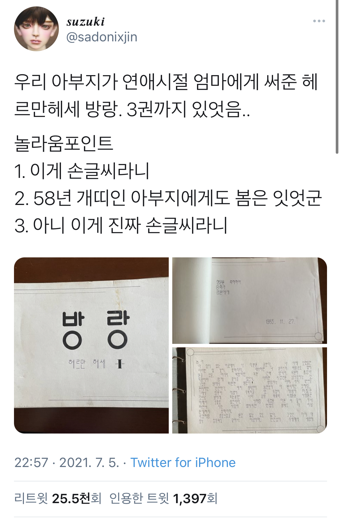 트위터에서 아버지의 글씨체가 화제가 되고 있습니다. ^^